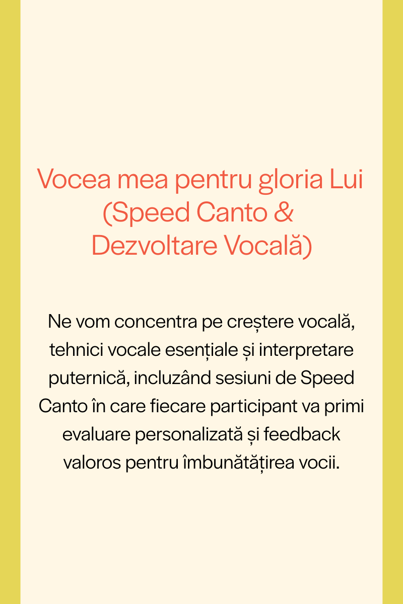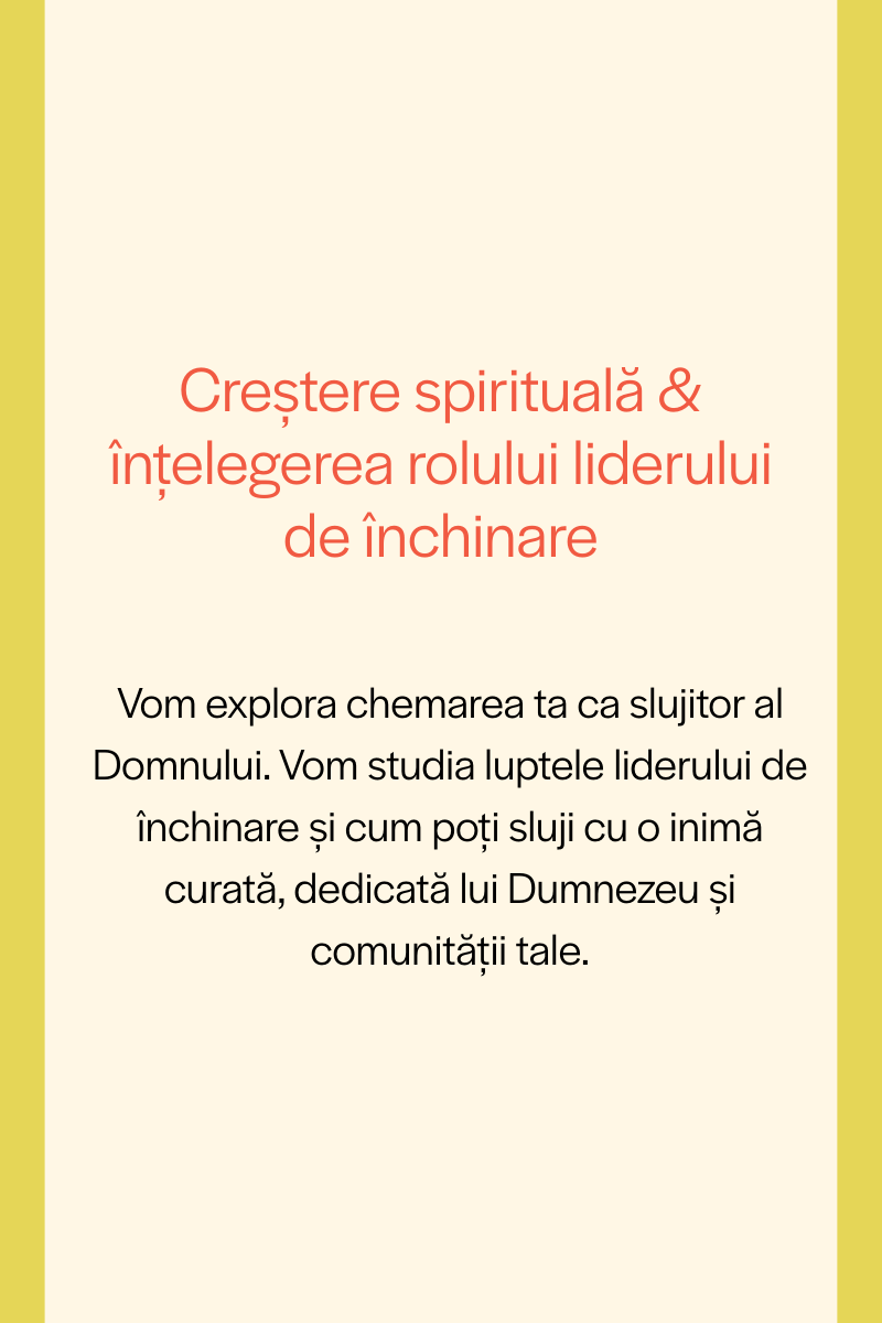 Dacă ești lider de închinare activ în biserica ta, acest curs te va ajuta să îți înțelegi chemarea, să îți dezvolți abilitățile vocale și să te echipezi pentru a înfrunta bătăliile spirituale pe care le întâmpini în această slujire. Vei fi provocat să mergi mai adânc în relația ta cu Dumnezeu și să trăiești o închinare autentică.